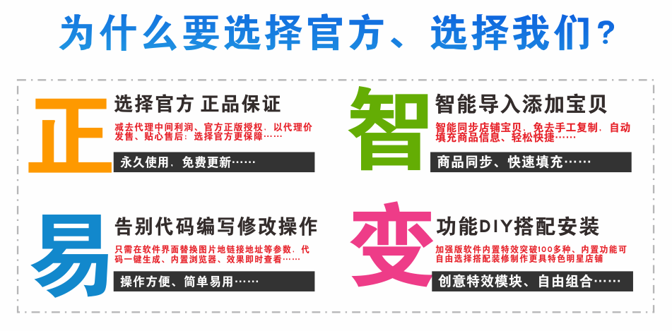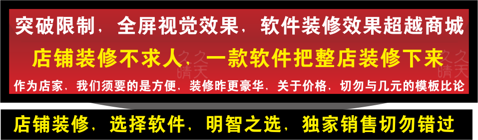 店鋪裝修必備軟件,提供免費(fèi)更新,多店使用,很少購(gòu)買(mǎi)很長(zhǎng)時(shí)間使用、無(wú)需續(xù)費(fèi),以后再也不用買(mǎi)模板了 | ||||||||||||