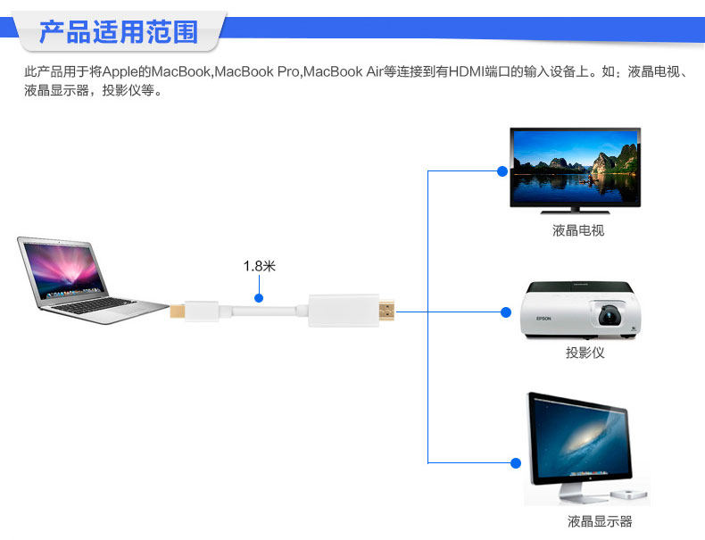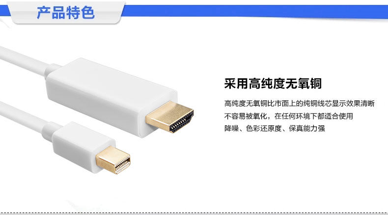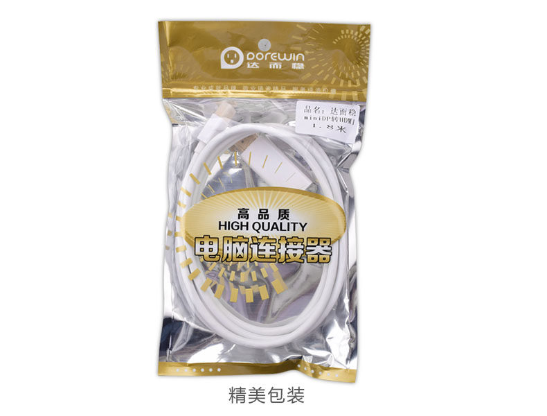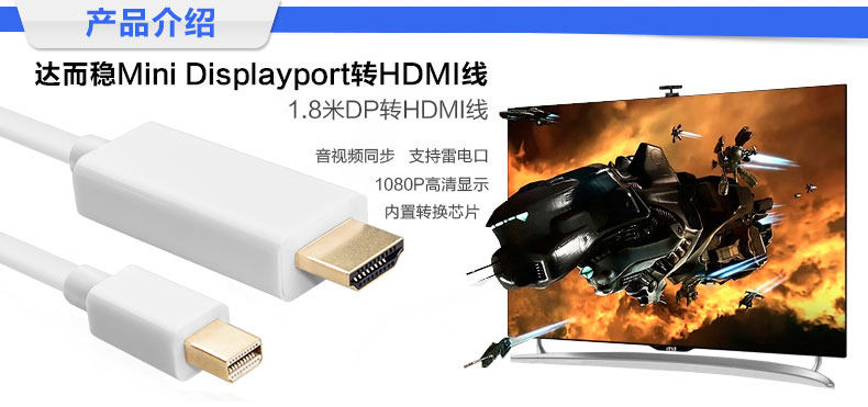 達而穩(wěn)Mini Displayport轉HDMI轉換線,是蘋果專為MacBook及PowerBook等設計的新一代視頻輸出接口。使用其可直接把電腦上的Mini DP接口輸出到外部擁有HDMI接口的顯示器、投影機等顯示設備。這樣的外部顯示設備可以延伸您的桌面,或者同步顯示您的桌面。