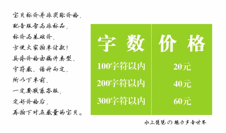 ●特別注意:錄制成品后不能再更換播音老師,老師播音語氣問題可免費修改,如更換老師需另行付費。
