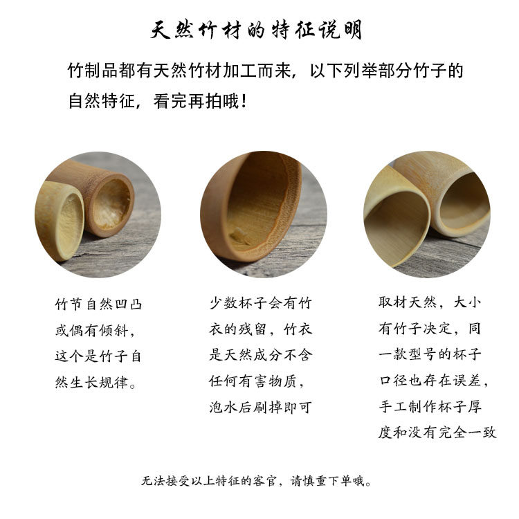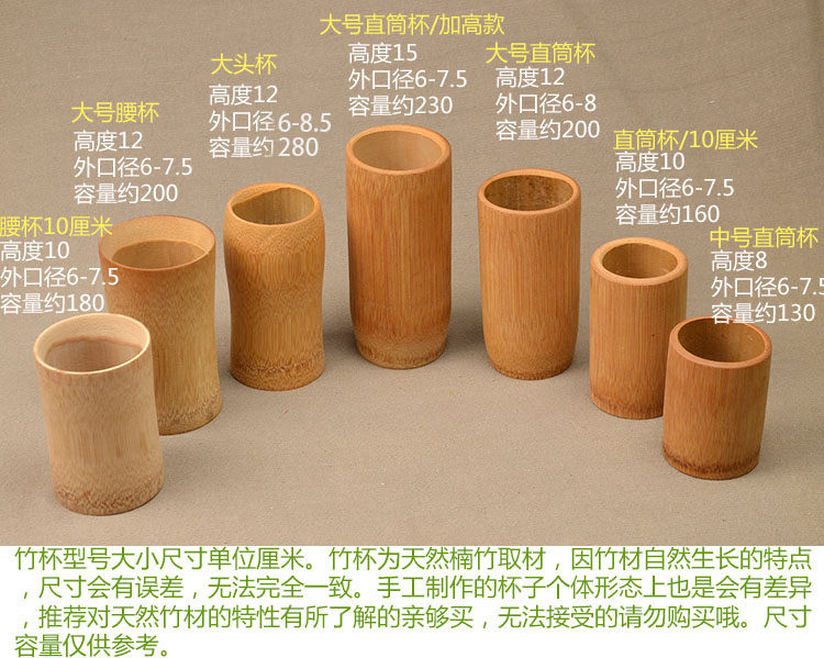竹杯口徑標(biāo)注都是指外徑,竹子自然生長,直徑是大小不一,成批的杯子發(fā)貨時(shí)會(huì)盡量挑口徑差距不大的發(fā),但也不是完全一樣。要求一致的請謹(jǐn)慎購買。