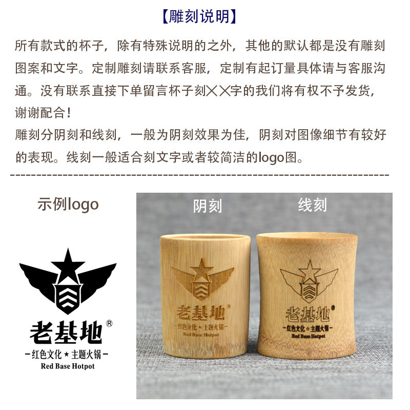竹杯口徑標(biāo)注都是指外徑,竹杯默認(rèn)都是沒有圖案及文字,如需刻字 請客服(以下是雕刻效果參考)
