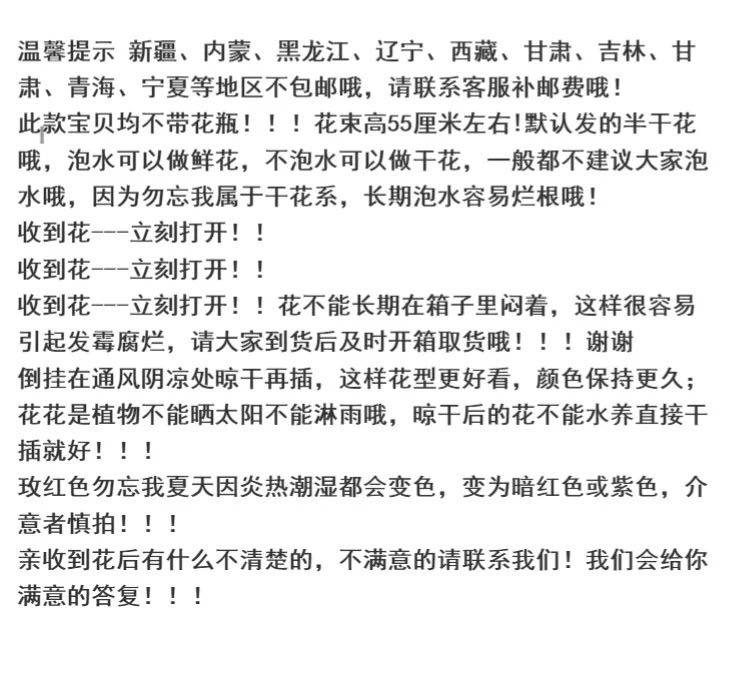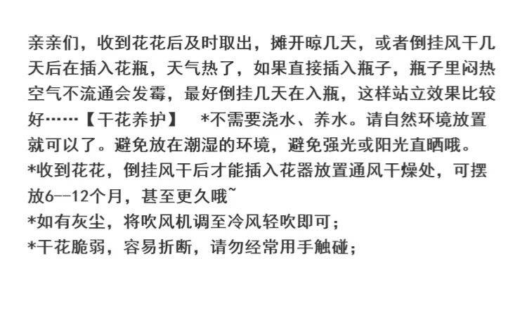 云南花農(nóng)自產(chǎn)自銷 ,不忘初心,由于全干的花在運(yùn)輸中容易損壞,所以我們默認(rèn)發(fā)半干或者新鮮的花哦,親們可以根據(jù)自己的需求留言哦!到貨后先倒掛風(fēng)干幾天哦 倒掛可以讓花花站立效果比較好,新疆 內(nèi)蒙 黑龍江 吉林 甘肅 寧夏 青海 西藏 遼寧 等地區(qū)不包郵哦……