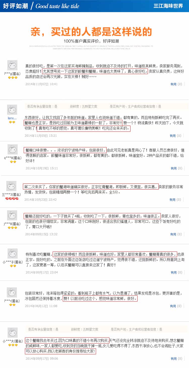 為什么說(shuō)我們的蟹糊的銷量那么好呢??因?yàn)槲覀冏龅氖橇夹钠焚|(zhì),“膏多膏紅”“蟹肉鮮蟹肉嫩”是我們對(duì)您的承諾,請(qǐng)您放心!