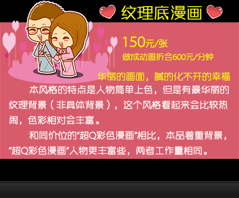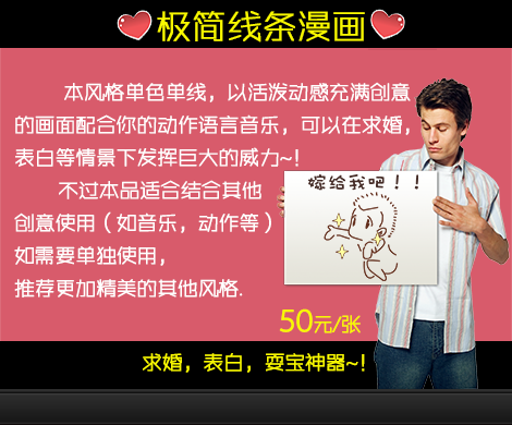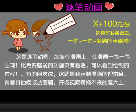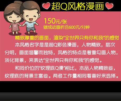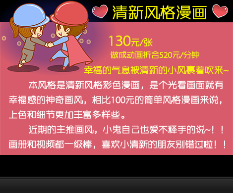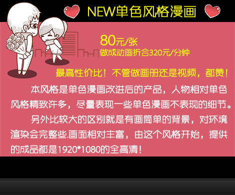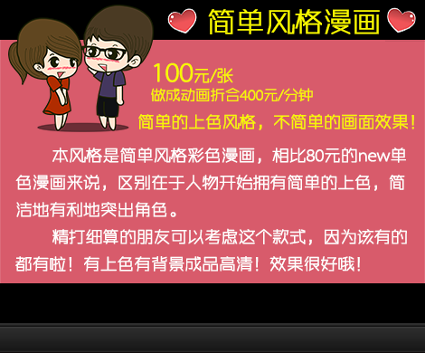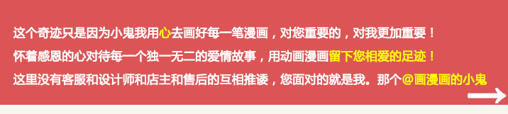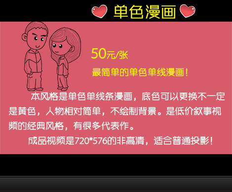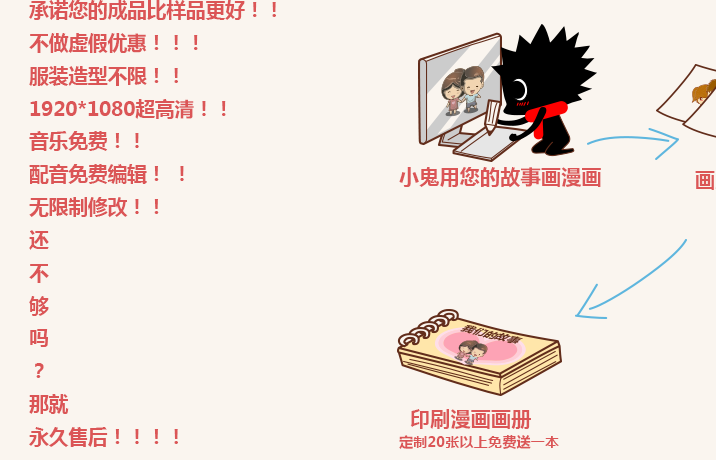 關(guān)于風(fēng)格: 本風(fēng)格是單色單線條漫畫,底色可以更換不一定是黃色,人物相對簡單,不繪制背景。 是低價(jià)敘事視頻的經(jīng)典風(fēng)格,有很多代表作。 非常后的視頻提供的是電視/投影布的720*576的分辨率。 關(guān)于價(jià)格:小鬼自己就是您的專屬設(shè)計(jì)師,標(biāo)的,報(bào)的是實(shí)價(jià),議價(jià)的時(shí)間寧愿拿來多畫幾筆, 如果對價(jià)格有異議可以在搜索同等品質(zhì)的作品來對比,(一樣的品質(zhì)我們比價(jià)格,一樣的價(jià)格我們比品質(zhì)) 或者選擇其他風(fēng)格的作品(詳見頁頭的黑板)。我們針對工作量大小進(jìn)行了分類價(jià)格.每個(gè)人都會(huì)選擇到適合自己的風(fēng)格。 關(guān)于品質(zhì):我們沒有漫畫團(tuán)隊(duì),繪畫沒有團(tuán)隊(duì),梵高的畫不可能讓達(dá)芬奇來續(xù)筆. 小店從裝修到每一個(gè)作品都是小鬼自己一筆筆畫出來的 所以我們品質(zhì)永遠(yuǎn)純凈,非常好的永遠(yuǎn)是下一部作品,而不是樣品 全很少承諾:無限期售后 當(dāng)您老了.在電視機(jī)前看當(dāng)年的故事的時(shí)候,突然想起,哎,這幅畫面當(dāng)時(shí)的他有打領(lǐng)帶. 沒關(guān)系,也同樣變老的小鬼,我馬上為您修改畫面. 制作流程1、和小鬼溝通后提供相應(yīng)資料 2、拍下小鬼提供的寶貝鏈接付款到支付寶 3、開始制作后,2天左右發(fā)效果圖 4、效果圖ok后,2天左右發(fā)草稿 5、草稿確認(rèn)沒問題后3天左右成品 6、成品確認(rèn)沒問題后,2天發(fā)送動(dòng)畫小樣。 7、修改到滿意后確認(rèn)收貨,發(fā)您高清視頻/圖片. 流程完成,進(jìn)入無限期售后,有問題可以隨時(shí). 需要準(zhǔn)備的資料故事劇本和正面照片(漫畫故事以敘事為主,人物除了發(fā)型眼鏡等大特征外,和真人沒有相似度)