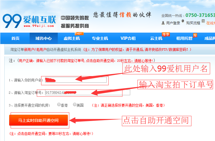 2、再打開http://www.99aiji.com/autohost.asp(復(fù)制打開網(wǎng)址)輸入付款后的訂單號和會員號點擊自助開通。不用客服讓開通<24小時全自助自己開通,24小時自己做主>