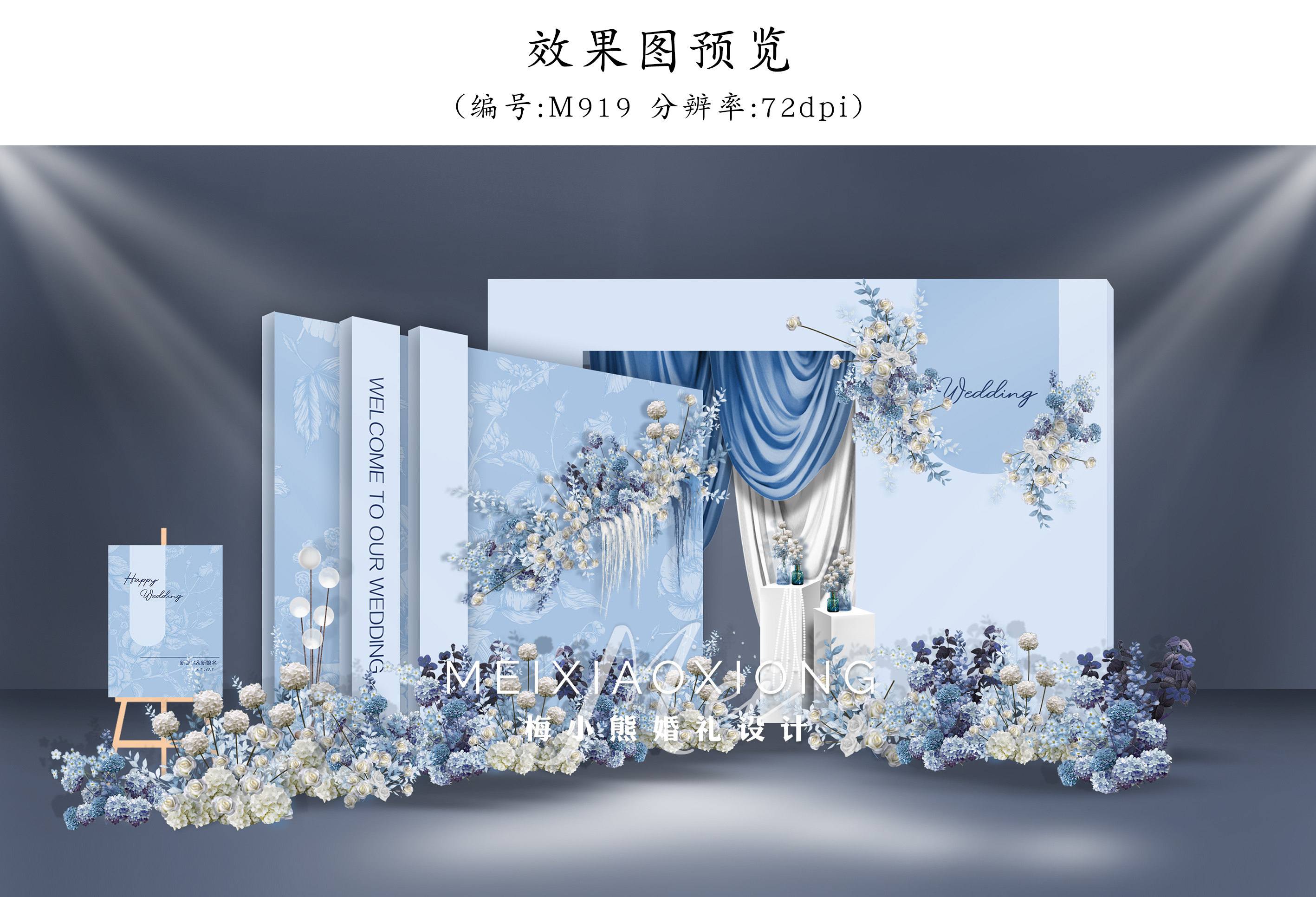 藍(lán)色婚禮設(shè)計(jì)效果圖 迎賓簽到區(qū)結(jié)婚背景墻KT板布置psd素材模板