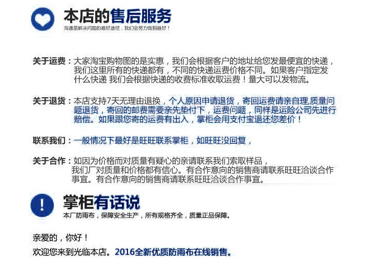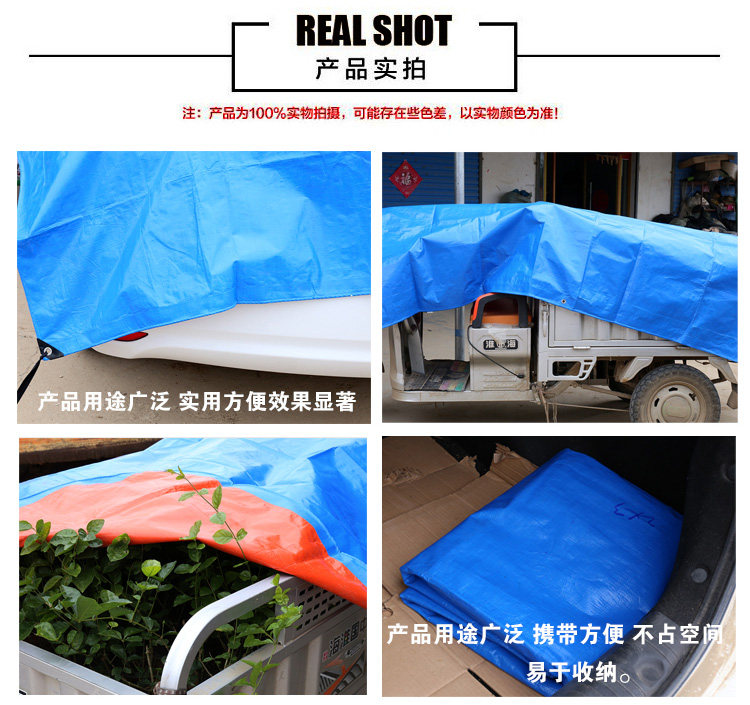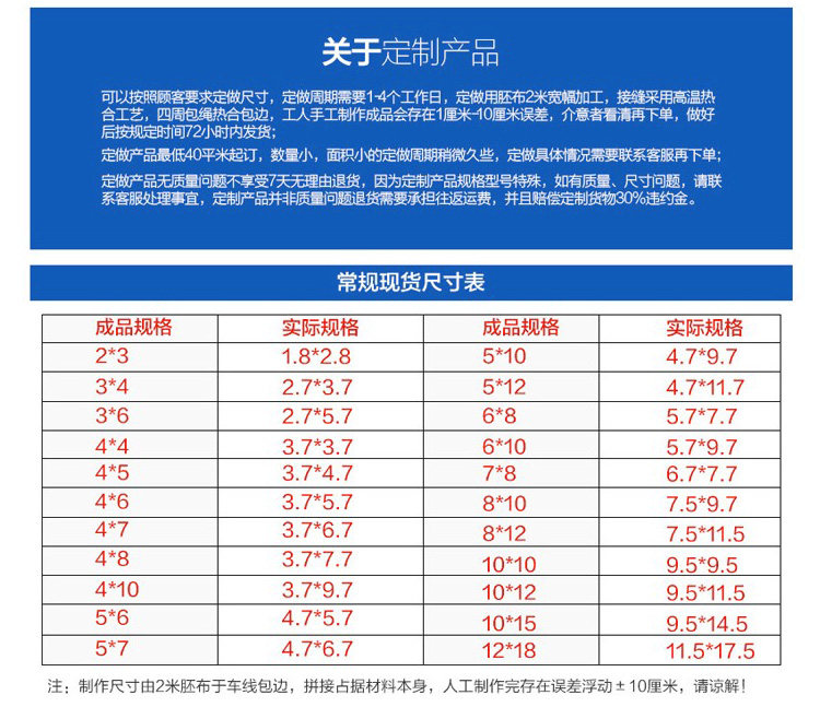 說明:由于雨布廠家來時都包了邊,所以廠家將包邊、拼接的布都算上了,也就是說10*12的雨布實(shí)數(shù)約9.7米左右*11.7米左右,本店所有款的雨布都是類似。 定做篷布一律不調(diào)退哦 親理解下