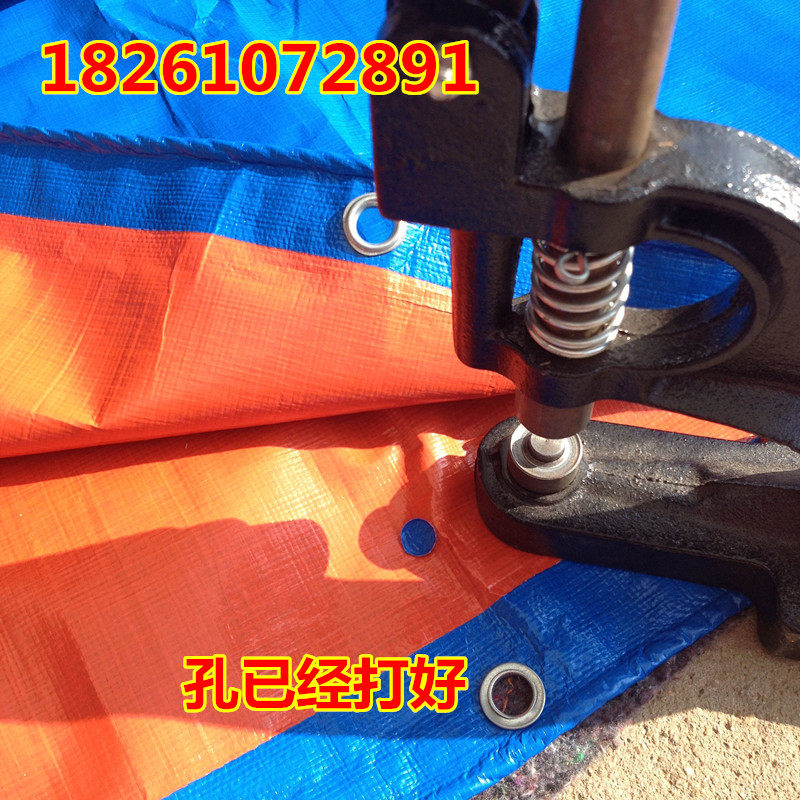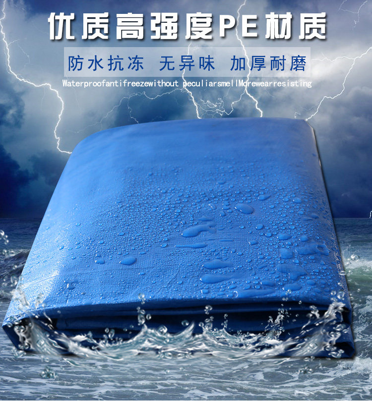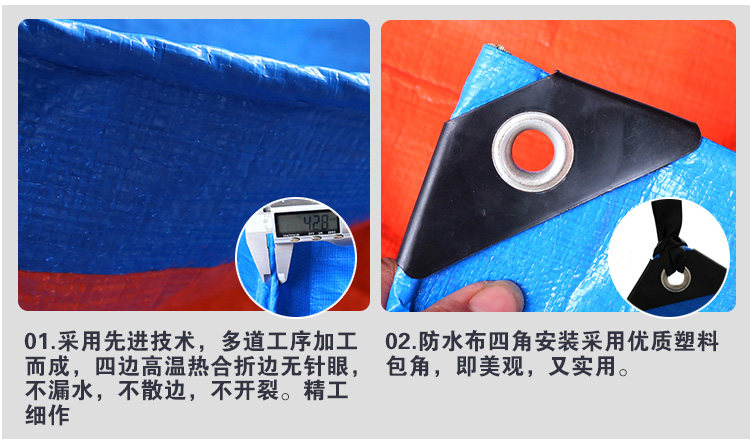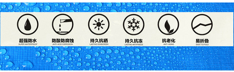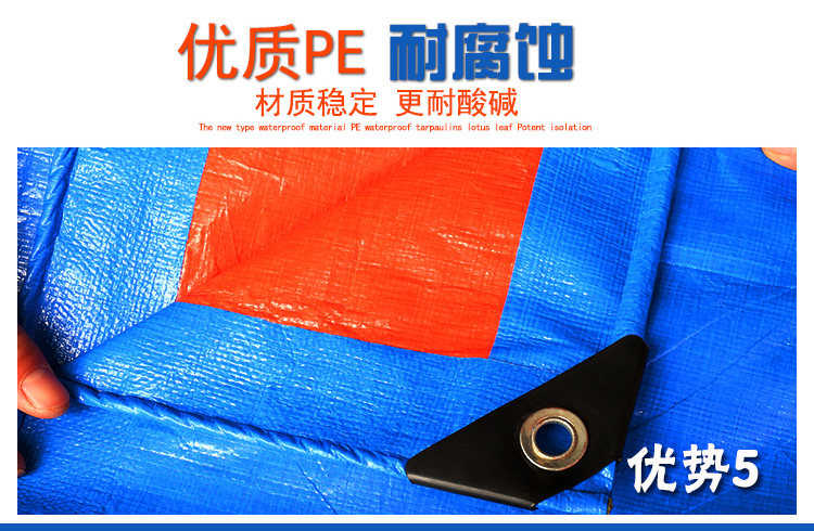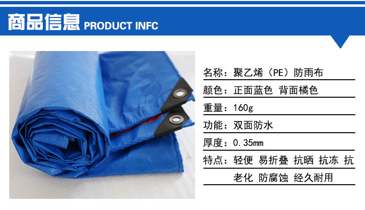 特點(diǎn):防風(fēng)防水防雨防曬,易折疊。四個邊都是雙層的藍(lán)布包邊,四個角和四個邊都打了扣眼,可以系繩子。