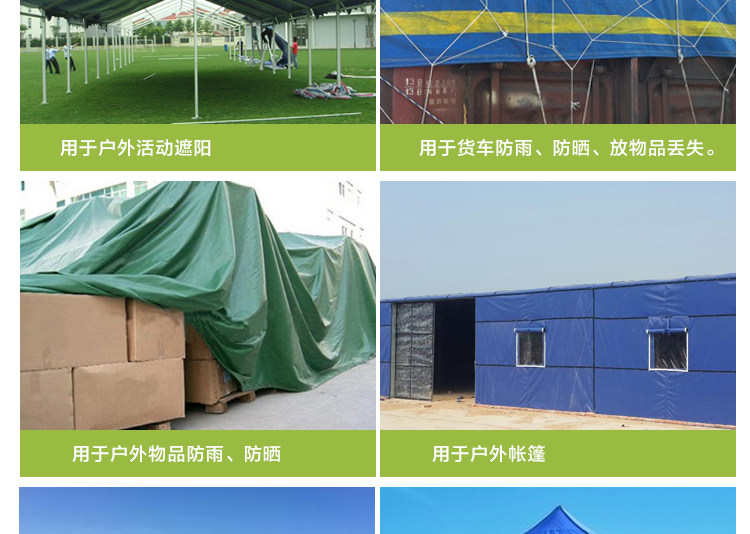 用途:適合各類戶外的遮陽和遮雨及制作遮陽篷.遮陽帆.防潮墊.地席.雨蓬等使用,廣泛用于車輛、船、廠礦企業(yè)貨物的遮蓋、野外旅游等多種用途