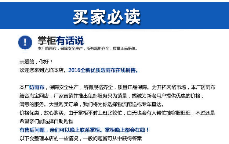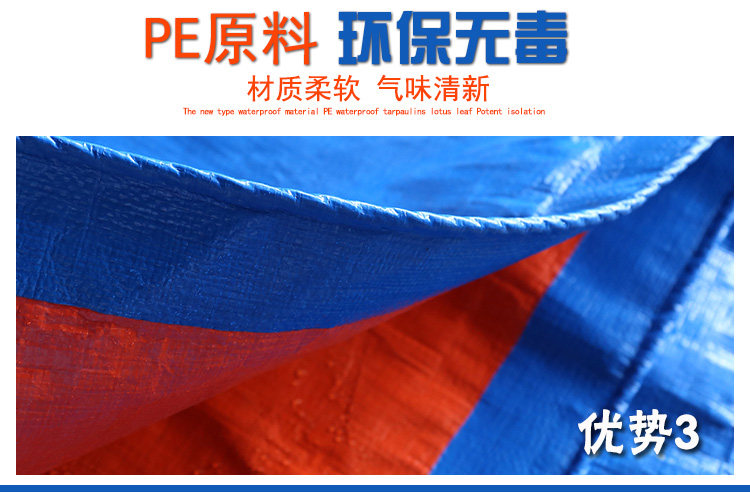 注意哦!!!現(xiàn)市場上出現(xiàn)了好多仿品,請親在購買的時候擦亮眼睛啊。普通藍(lán)桔雨布色澤很差,更不用說防水防曬了,特級的是新型聚乙烯材料制成的,不是聚丙烯的啊 ,我們的雨布無毒無味,經(jīng)久耐用的哦。一份價錢一份貨,我們只賣正品