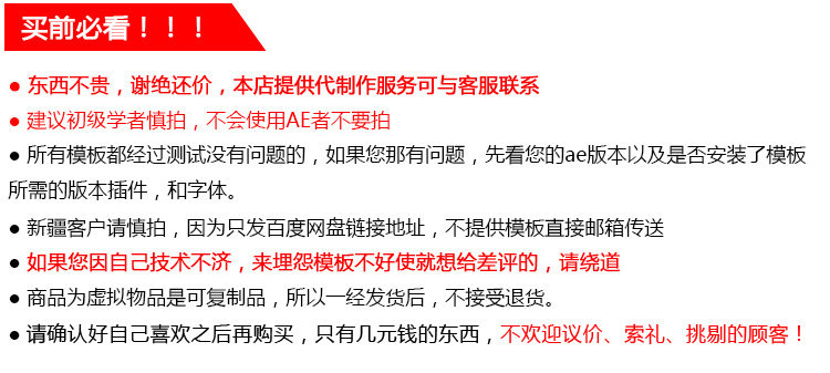 模板需要AE軟件打開(kāi),建議有AE基礎(chǔ)的朋友購(gòu)買使用。不會(huì)AE的請(qǐng) 謹(jǐn)慎購(gòu)買,本店不負(fù)責(zé)教學(xué),不做任何技術(shù)指導(dǎo)。謝謝合作。