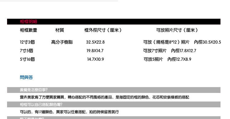 - 顏色分類:24框地中海(藍色木紋+白色)24框地中海(天藍色+白色)24框地中海(全白色)24框地中海(天藍+藍色木紋)24框地中海(全天藍色)24框純色(天藍+草綠+檸檬黃24框悅套餐(原木+白+柚木)24框曼哈頓套餐(黑+白)24框純色套餐(大紅+淡粉+白24框曼哈頓(大紅+黑+白)24框回眸套餐(黑+白)24框純色套餐(檸檬黃+白色)24框悅套餐(檸黃+橙黃+原木24框浪漫有約套餐(玫紅+白)24框浪漫有約套餐(全淡粉色)24框浪漫有約套餐(全白色)