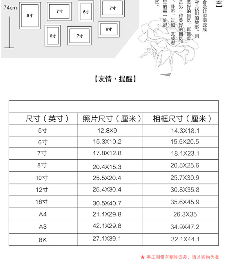 - 尺寸:5寸【擺掛通用】6寸【擺掛通用】7寸【擺掛通用】8寸【擺掛通用】10寸【擺掛通用】12寸【擺掛通用】16寸【掛墻】無畫芯A4【擺掛通用】A3【掛墻】無畫芯8K【掛墻】無畫芯10框照片墻