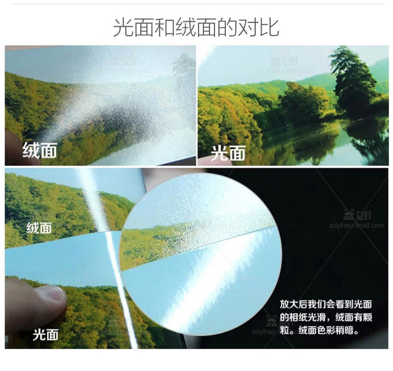 | 答:光面相紙表面光滑,顏色鮮艷,是常見的類型,會有反光現(xiàn)象,容易留指紋,一般適合自己外出游玩的隨拍照片。 |