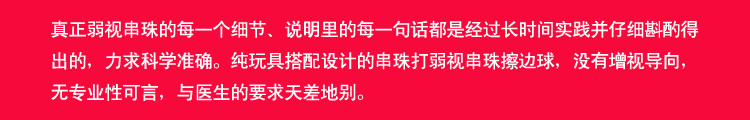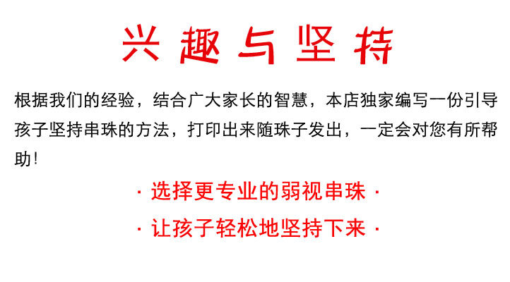 本串珠為我們設(shè)計(jì)的很不錯(cuò)款綜合性套裝串珠,搭配與數(shù)量代表目前弱視串珠前沿水片本店產(chǎn)品每天都在升級(jí),做為弱視產(chǎn)品的走在前沿者,歡迎家長朋友們持續(xù)關(guān)注和支持。