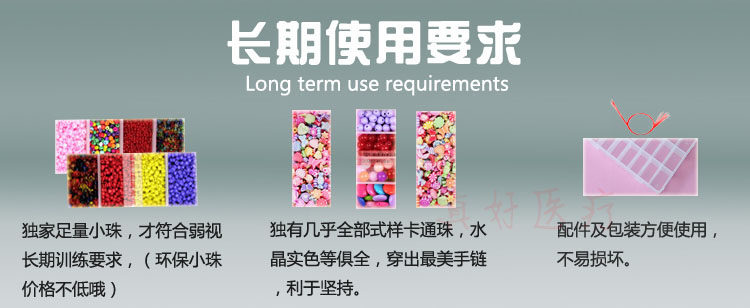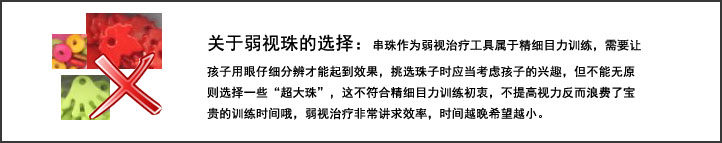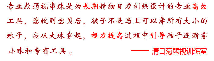 2, 串珠屬于精細(xì)目力訓(xùn)練,穿小珠效果好,有近視傾向而進(jìn)行一段時(shí)間的近距離弱視訓(xùn)練無效者,是否繼續(xù)進(jìn)行近距離弱視訓(xùn)練要遵醫(yī)囑。這種情況可用遠(yuǎn)方精細(xì)訓(xùn)練替代。