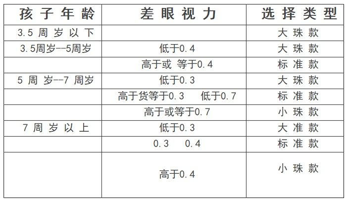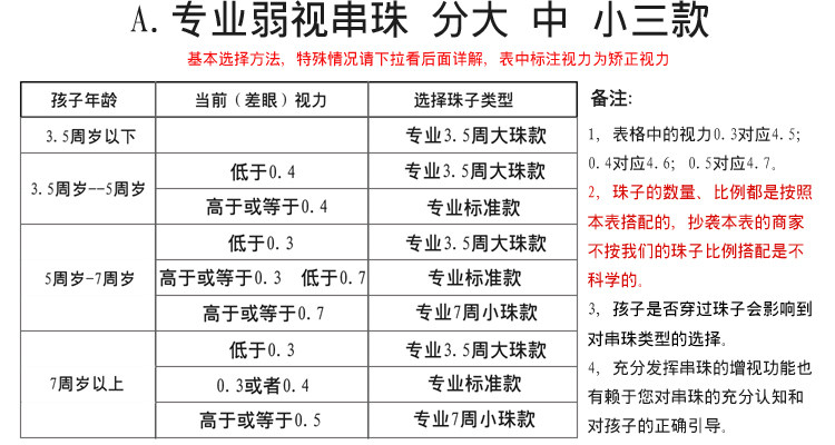 依據(jù)我們的經(jīng)驗(yàn),以孩子的年齡和矯正視力狀況做參考,我們的串珠分為大珠款、標(biāo)準(zhǔn)款、小珠款。三款之間格局相同,大小有些差異。簡單選擇方法如下: