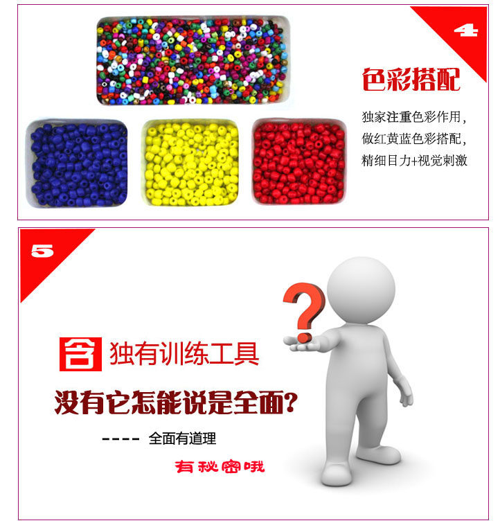 3,為長期使用考慮,從孩子操作的每一個(gè)細(xì)節(jié)出發(fā)設(shè)計(jì)串珠,存放、挑珠、找孔、穿進(jìn)等,更精準(zhǔn)有效;