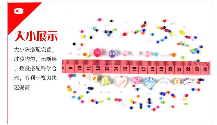 2,每款都有30式樣以上的卡通珠子,數(shù)種不同材質(zhì)的多彩珠(種類多更吸引!),數(shù)量非常豐富的米珠(弱視訓(xùn)練用小珠子永遠(yuǎn)不嫌多!)