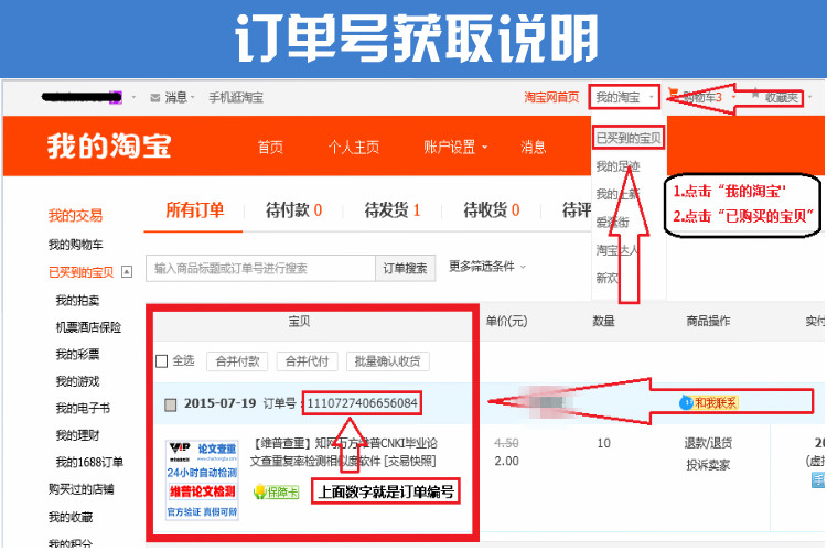 4.點(diǎn)開[已買到的寶貝]頁(yè)面,復(fù)制剛拍下的寶貝訂單號(hào),粘貼到檢測(cè)網(wǎng)站的訂單號(hào)輸入框中,然后點(diǎn)擊[立即檢測(cè)]。 注:如果你提交的訂單號(hào)金額不足,會(huì)導(dǎo)致檢測(cè)失敗。