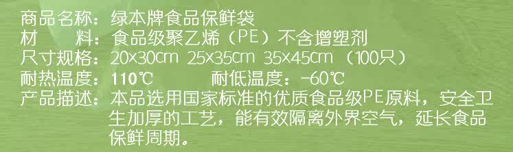 綠本食品保鮮袋/加厚型點(diǎn)斷式100只/無毒無味廚房冰箱冷藏特惠裝推廣熱賣行情