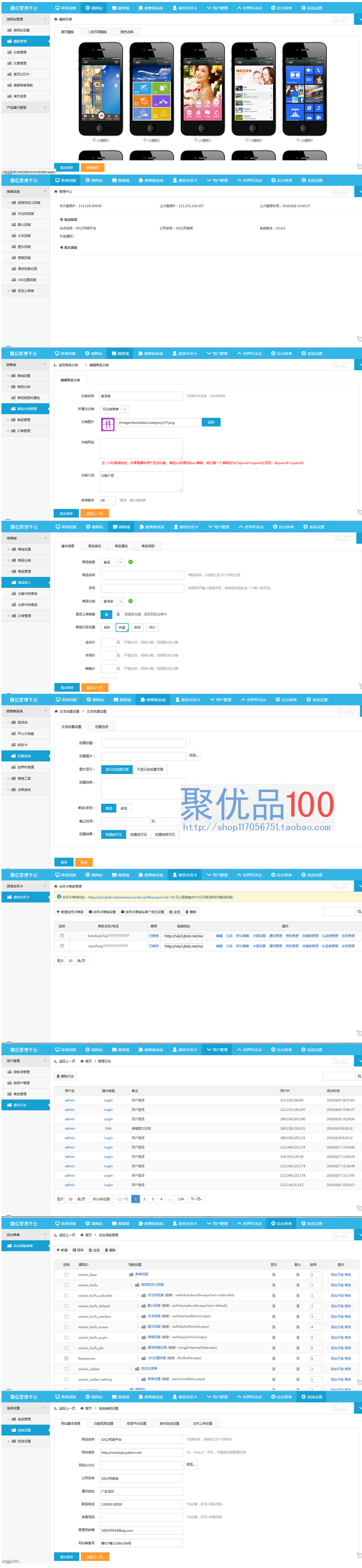 2、微網(wǎng)站:微網(wǎng)站設(shè)置、模板管理、分類管理、文章管理、首頁幻燈片、底部菜單導(dǎo)航、單頁 信息、產(chǎn)品展示管理。