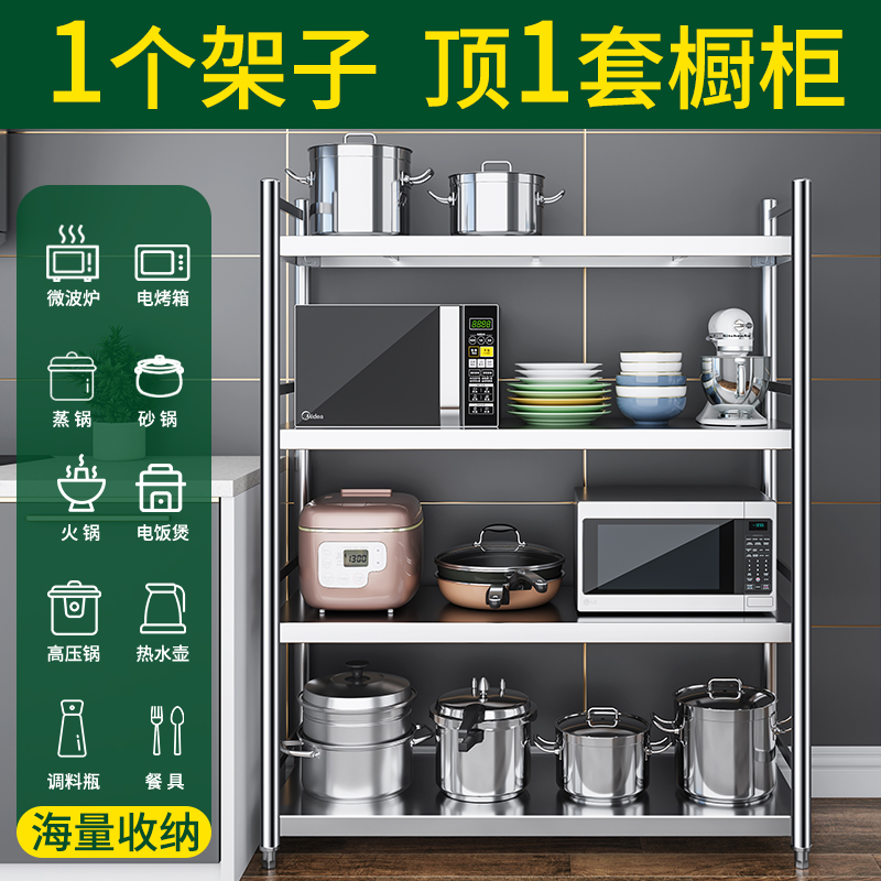 廚房/烹飪用具^廚房置物架/置物柜/角架^^^河南 鄭州^304廚房不銹鋼帶圍欄置物架落地式多層家用收納微波爐菜架子加厚