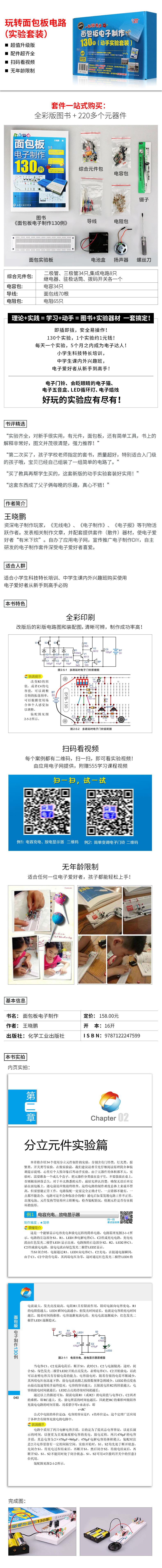 本套裝包含《面包板電子制作130例》四色印刷圖書和全部配書電子器件套件,內(nèi)涵電子基礎(chǔ)知識、130個電子制作的原理、裝配說明以及配套的電子器件,讀者使用本套裝,不僅可以學(xué)習理論知識,還能親自制作出電子產(chǎn)品,在學(xué)習中進行實踐。實驗采用面包板,即插即拔,安全易操作。本套裝無年齡限制,適合任何一位電子愛好者,是小學(xué)生科技特長、中學(xué)生課內(nèi)外興趣班以及電子愛好者從新手到高手的良師益友。