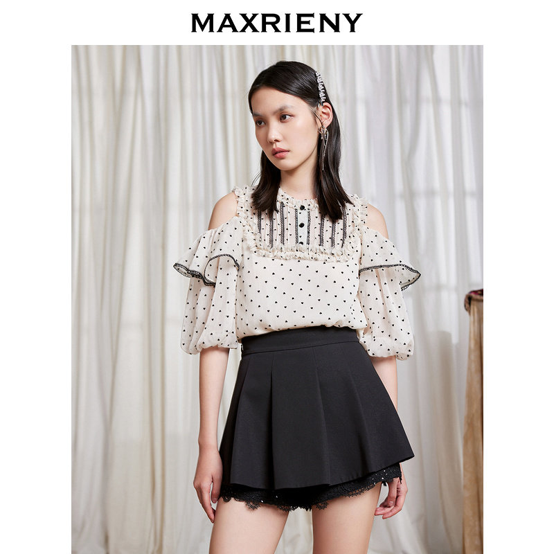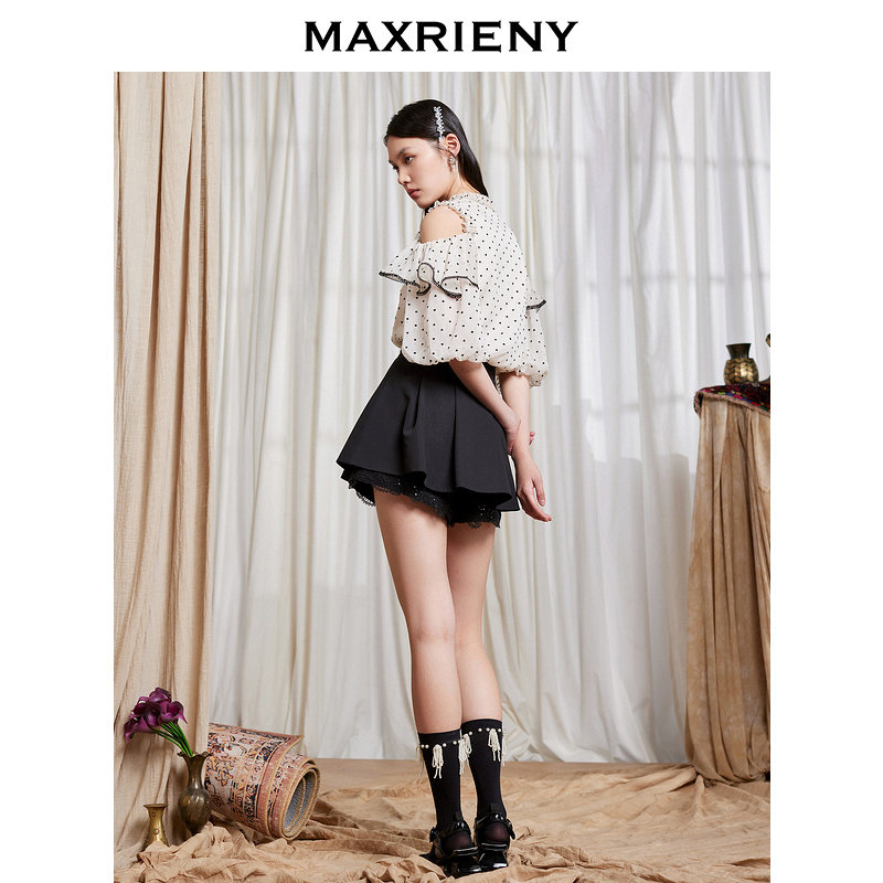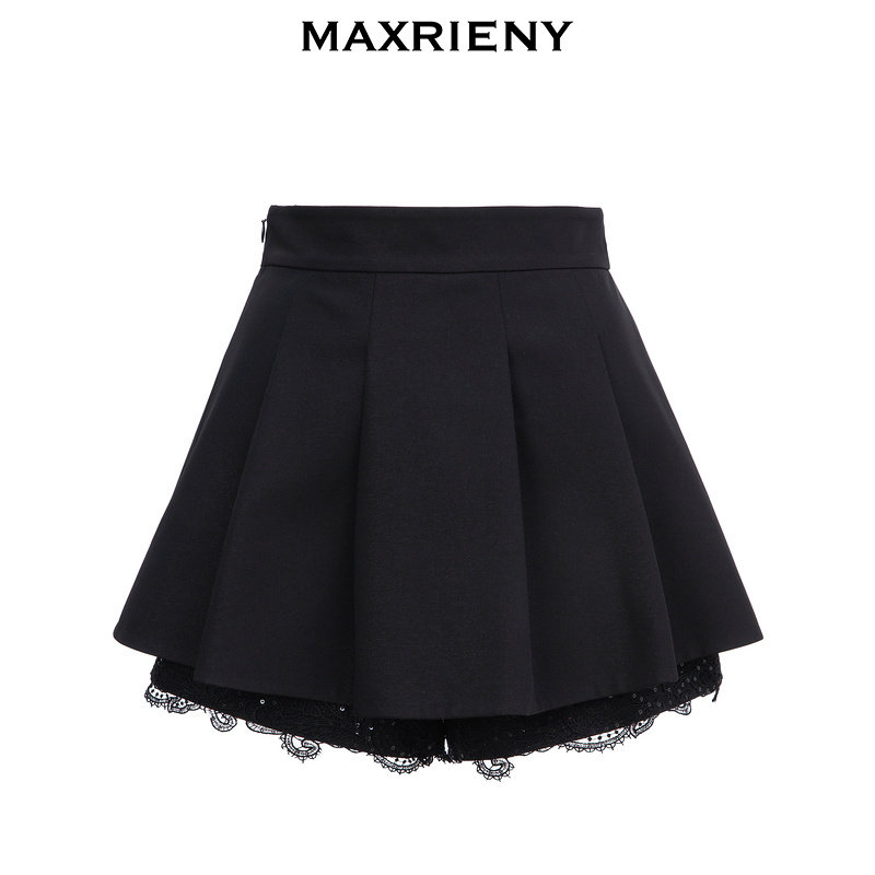 【商場同款】MAXRIENY蕾絲花邊百褶裙2022夏黑色半身裙洋氣短裙子推廣熱賣行情