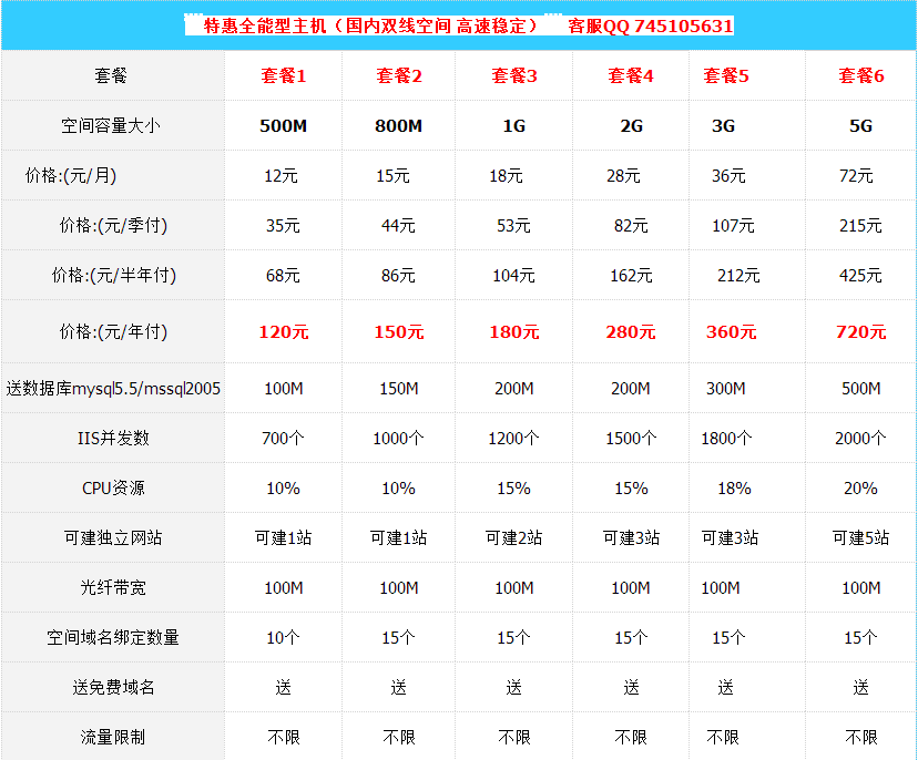 套餐1 500M (咨詢特價(jià))/月 (咨詢特價(jià))/季 (咨詢特價(jià))/半年 120/年 贈(zèng)100m mysql或mssql(咨詢特價(jià))