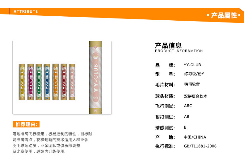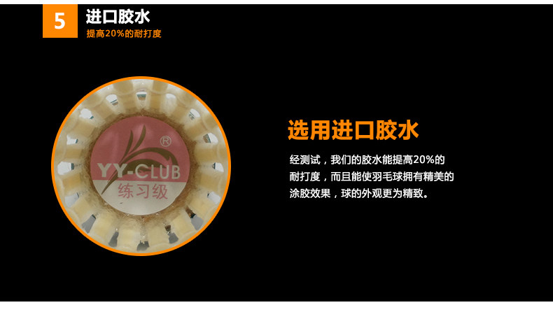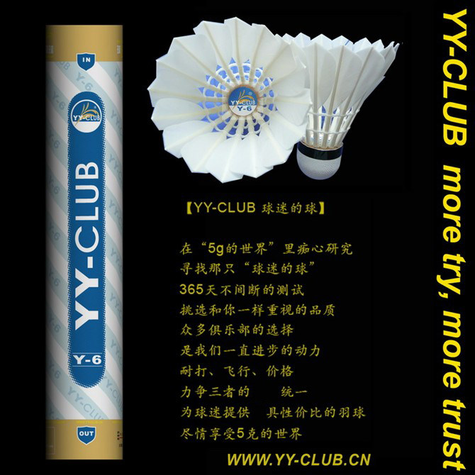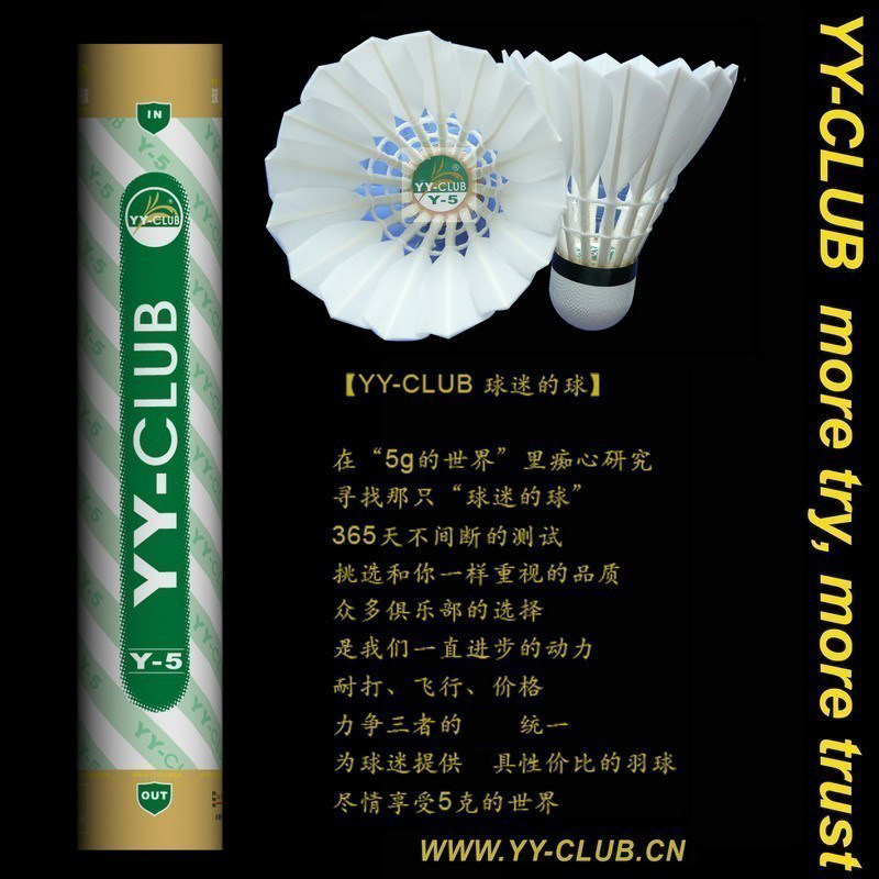 2008年9月,我們發(fā)現(xiàn)鶿鴣鴨毛是耐打性不錯,而且毛桿比較直,做出來的球,飛行也不錯,于是我們用鶿鴣鴨毛大方的球做了【YY-CLUB的綠Y5】,綠色代表郁郁蔥蔥,生機黯然,綠Y5的出品,預(yù)示著很多習(xí)慣打勝利金黃1號和綠勝利比賽3號的球友能有另外一種更具性價比的選擇。