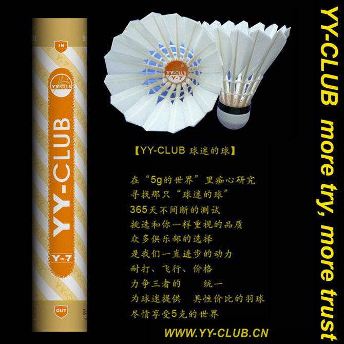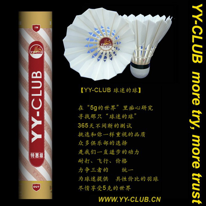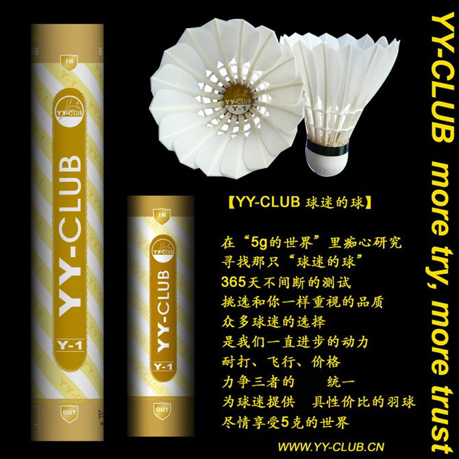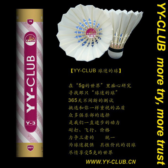 (咨詢特價)年3月,繼2009年成功的推薦【YY-CLUB球迷的球】【紫Y-3@飛行全A】,我們再次推出Y-3鵝毛耐打版,和YONEX AS-9還有勝利的大師6原版工藝,沿襲紫Y-3非常好飛行和心動的球感,價格也可以讓球友比較容易接受,如果以前打YONEX AS-9和勝利大師6號的球友,可以選擇紫Y-3鵝毛耐打版,感受YY-CLUB出品為您帶來的非常好耐打和心動球感.