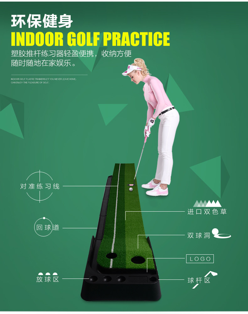 四, 采用進(jìn)口草皮,模擬真實(shí)的高爾夫球場速度,雙色球道,而且是雙球洞設(shè)計(jì),有大小兩個(gè)球洞,可以增加練習(xí)難度和樂趣,專業(yè)真實(shí)!
