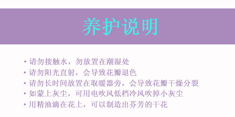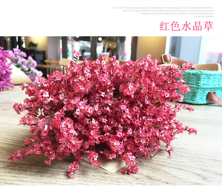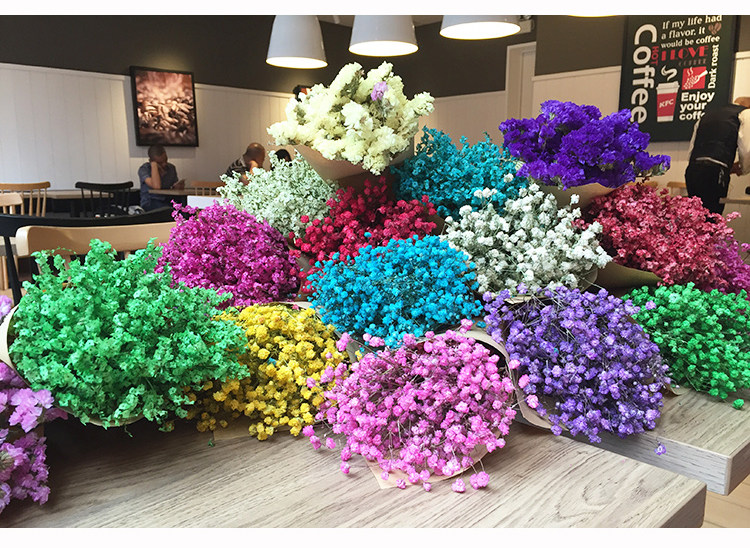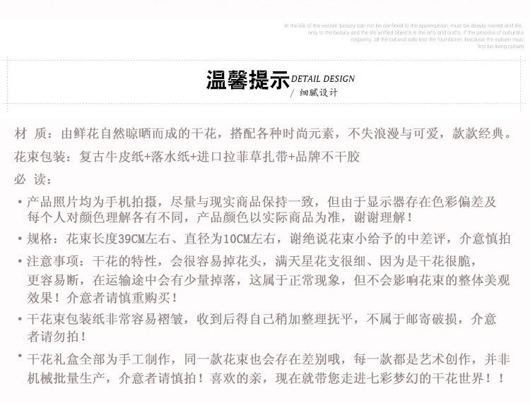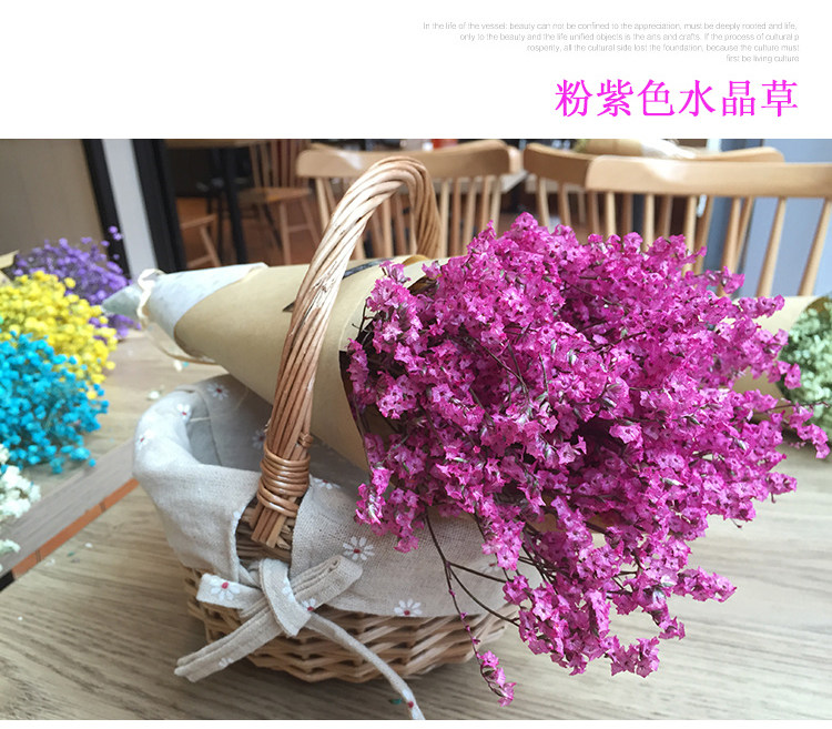 由于彩色的滿天星和水晶花是人工染色的,故每一批花的顏色有可能存在色差,親請(qǐng)諒解。