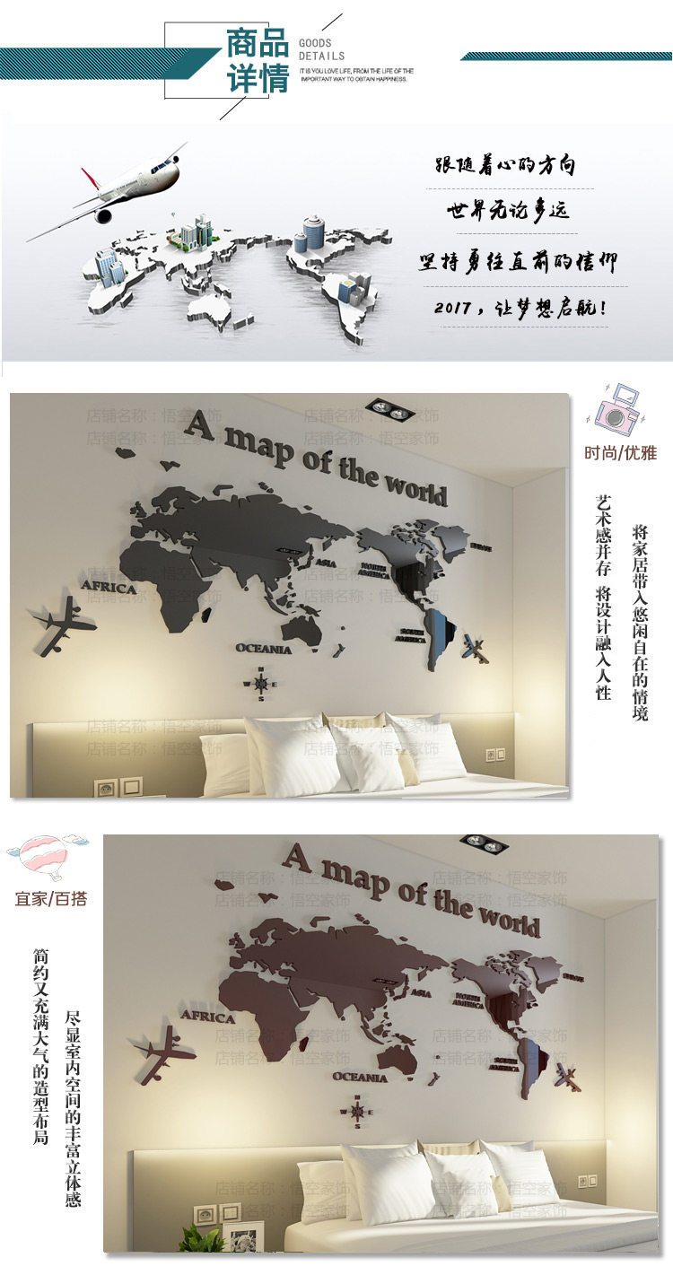 悟空家飾世界地圖墻貼3d立體辦公室裝飾現(xiàn)代簡約沙發(fā)背景墻壁貼紙推廣熱賣行情