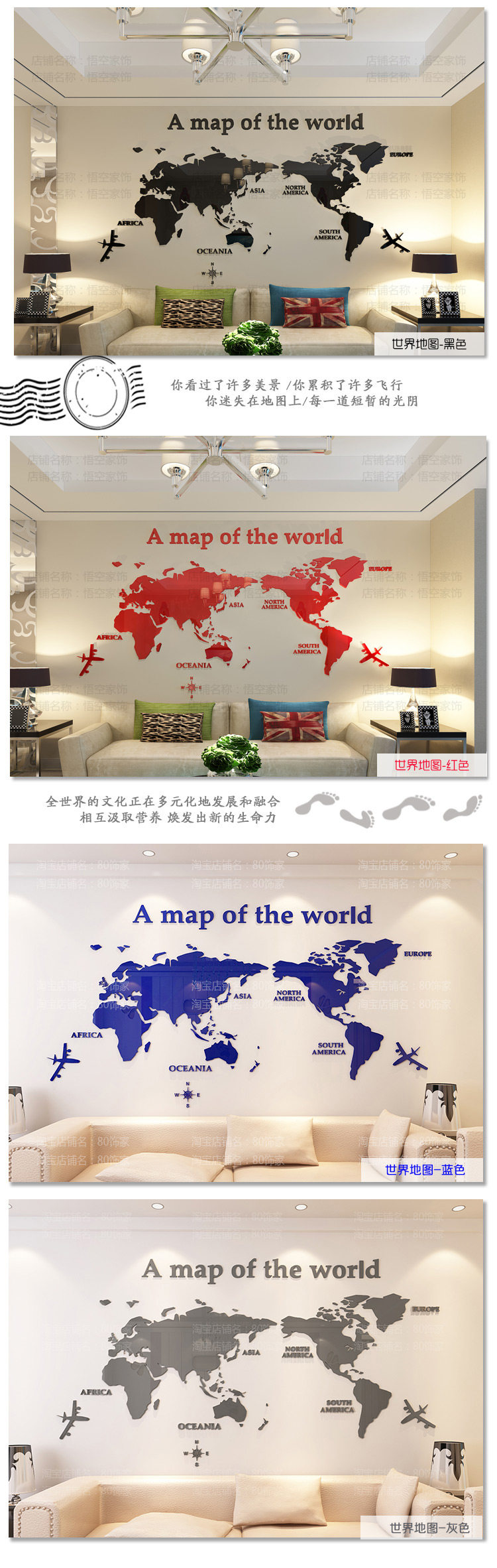 悟空家飾世界地圖墻貼3d立體辦公室裝飾現(xiàn)代簡約沙發(fā)背景墻壁貼紙價格行情