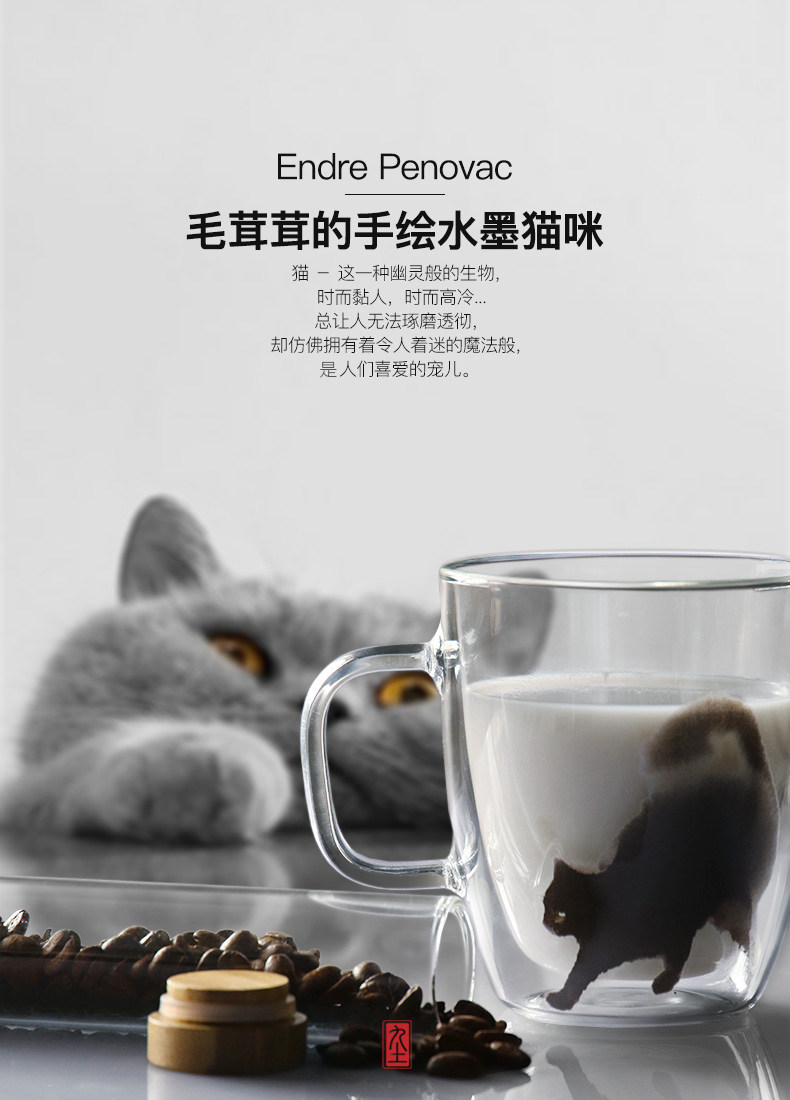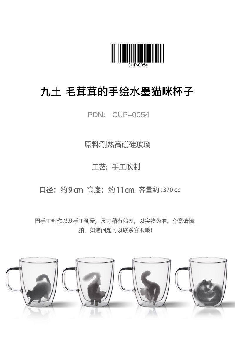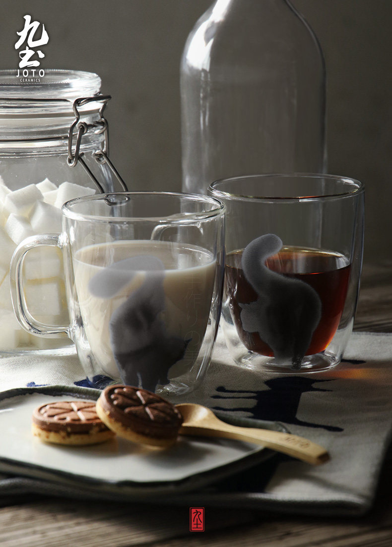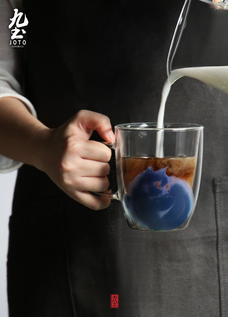 九土 純手工玻璃馬克咖啡杯辦公雙層不燙手隔熱貓咪藝術(shù)新品推廣熱賣行情