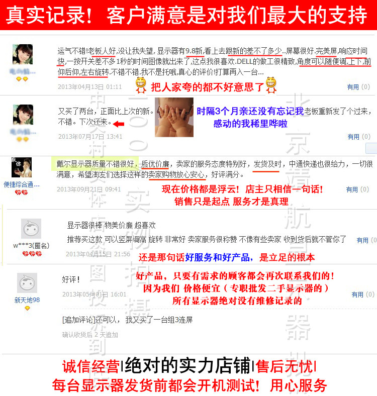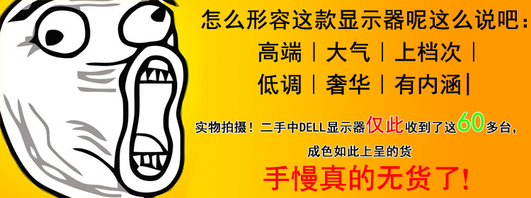 現(xiàn)貨戴爾17寸19寸液晶顯示屏,有需要的直接拍下 。大公司淘汰二手液晶顯示器//黑色//外觀9成新//屏無劃痕/無斑點/無亮點//標(biāo)準(zhǔn) 17”19” 4:3方屏//分辨率是(咨詢特價)24////效果特別好//免費質(zhì)保三個月!!此款顯示器沒有DVI接口! 超新//非常好屏!!另有15寸的(咨詢特價)!
