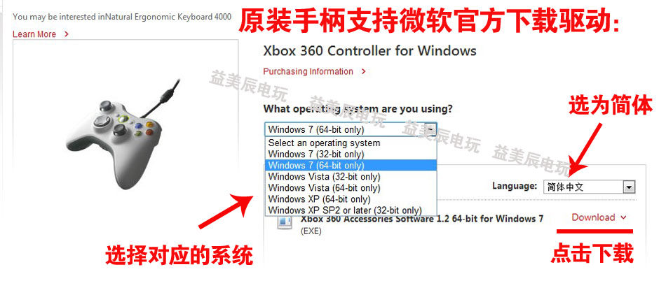 您的電腦如果沒有光驅(qū),微軟原裝手柄支持從微軟下載對(duì)應(yīng)的驅(qū)動(dòng):