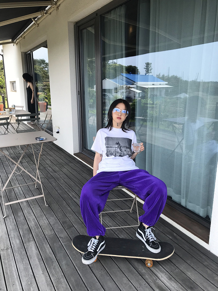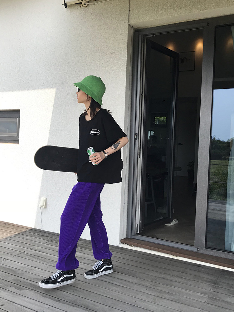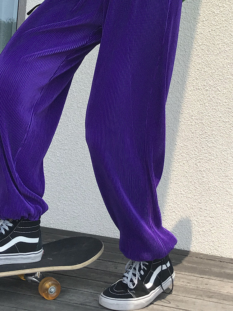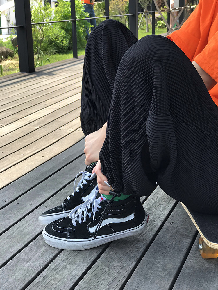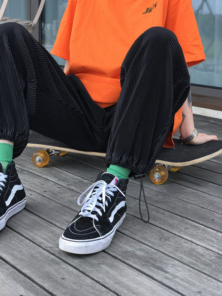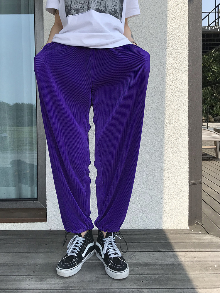 美伢FUZZYKON? 原創(chuàng)黑/紫夏季涼爽寬松壓褶收腳褲 2018女裝新款推廣熱賣行情