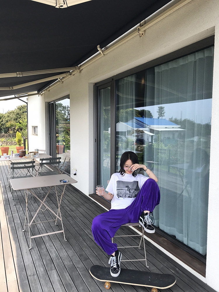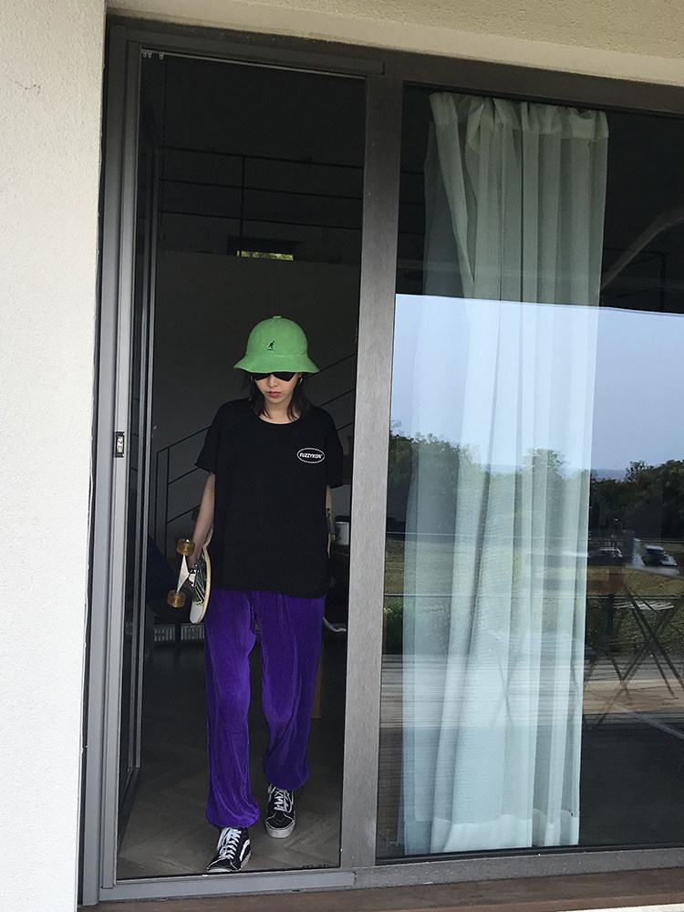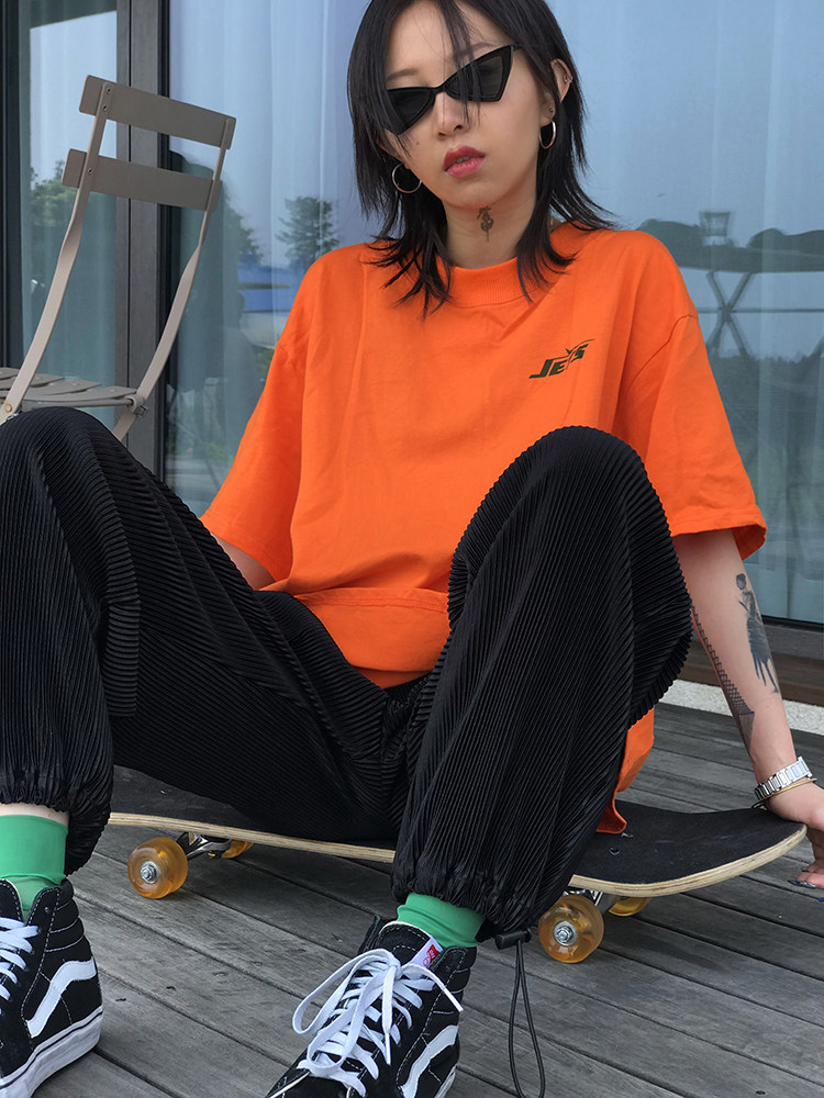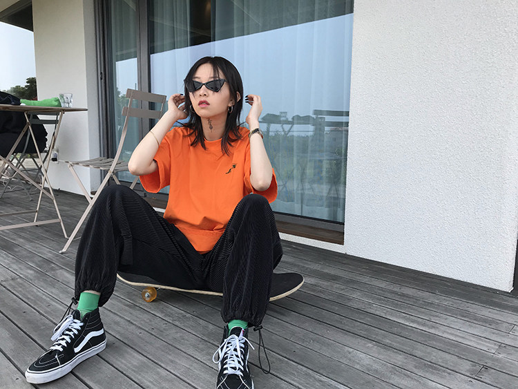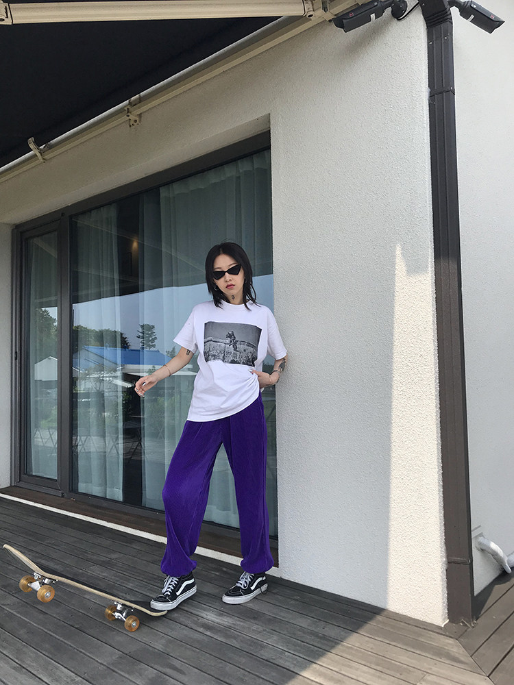 穿起來完全是無(wú)拘無(wú)束 直筒的褲型 下擺有橡筋抽繩可以收起來穿成收腳褲
