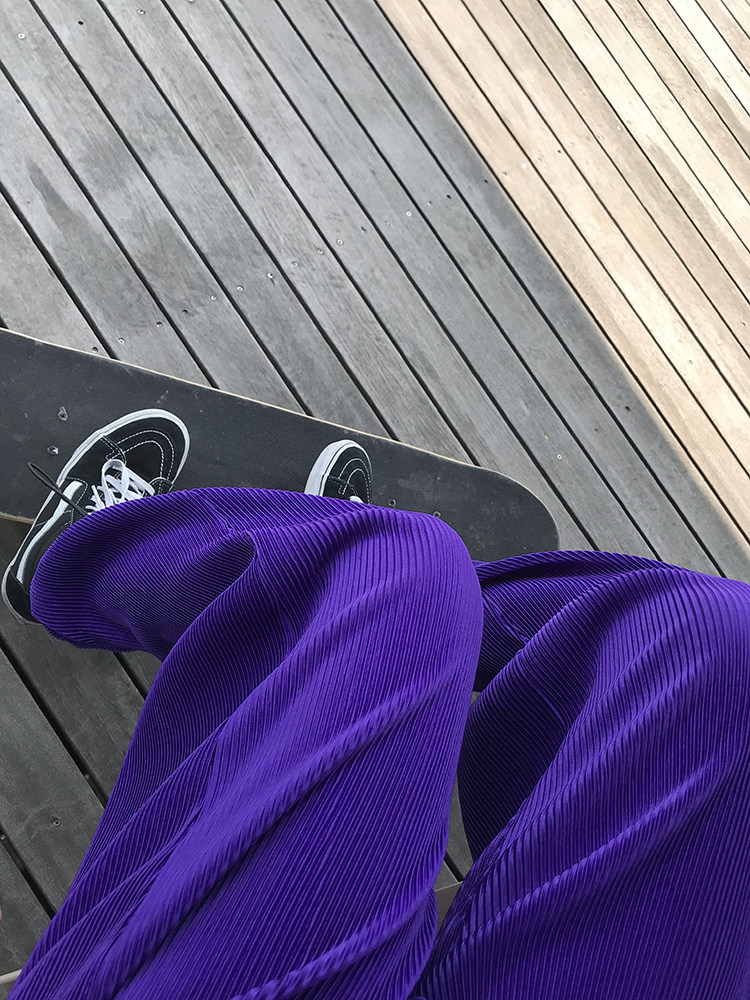 【描述】非常涼爽垂墜的面料 壓褶工藝 整條褲子能拉伸到很寬