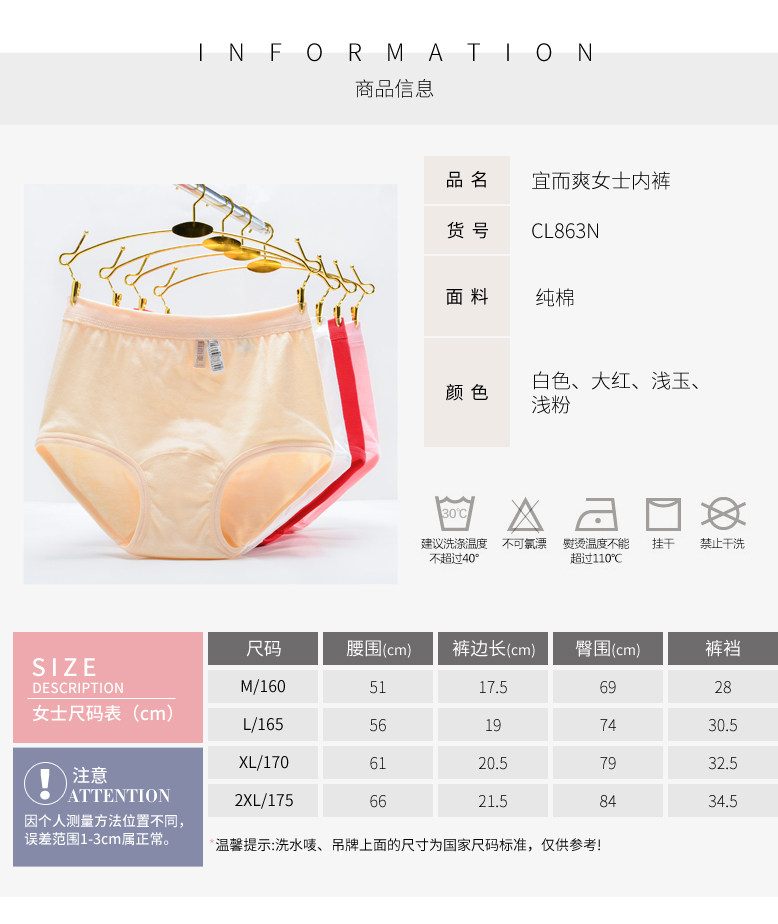 溫馨提示:宜而爽廠家此款內(nèi)褲升級(jí)新款了,新款的內(nèi)褲褲腳那邊沒有曲牙邊,老款是有曲牙邊的,倉庫里新老款隨機(jī)發(fā)哦!介意者慎拍!!!
