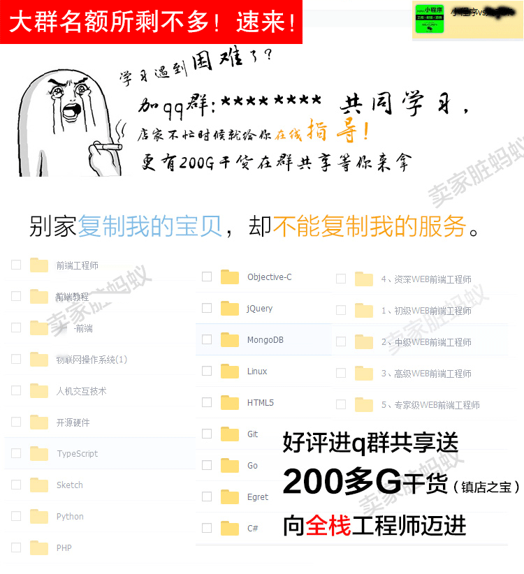 悄悄告訴你:買別家的進(jìn)不了我的群,近期發(fā)現(xiàn)有些人冒充或復(fù)制本寶貝,甚至連群都是我的,,現(xiàn)已升級為驗(yàn)證訂單昵稱進(jìn)群,在學(xué)習(xí)投入方面不要貪圖幾塊錢小便宜,沒有任何售后保證,他們甚至不知道什么是小程序,。我是前端工程師,有什么問題,會(huì)盡量在學(xué)習(xí)交流群為您解決。本寶貝學(xué)習(xí)交流大群已經(jīng)滿了兩個(gè)。每天都有人討論。快快加入大家庭吧O(∩_∩)O
