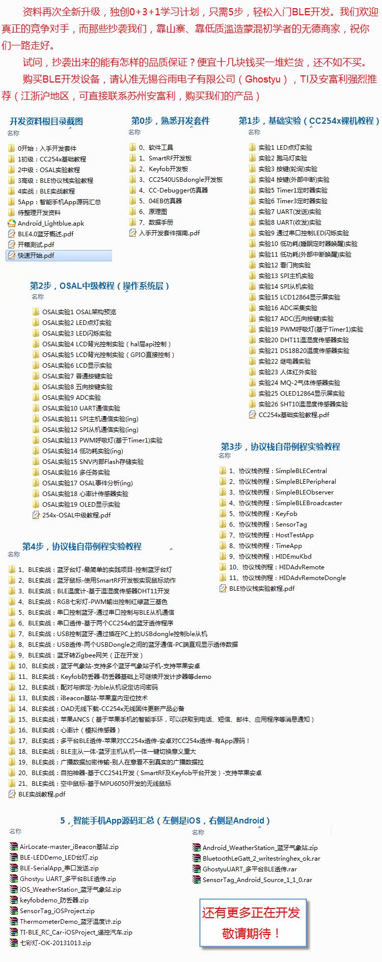 在第二代的CC254xEK開發(fā)套件上,我們開發(fā)了更多具有產(chǎn)品意義的實踐項目(全部開源),目前已有21個,仍在繼續(xù)。。。所有項目均提供測試OK的源碼以及配套pdf文檔。