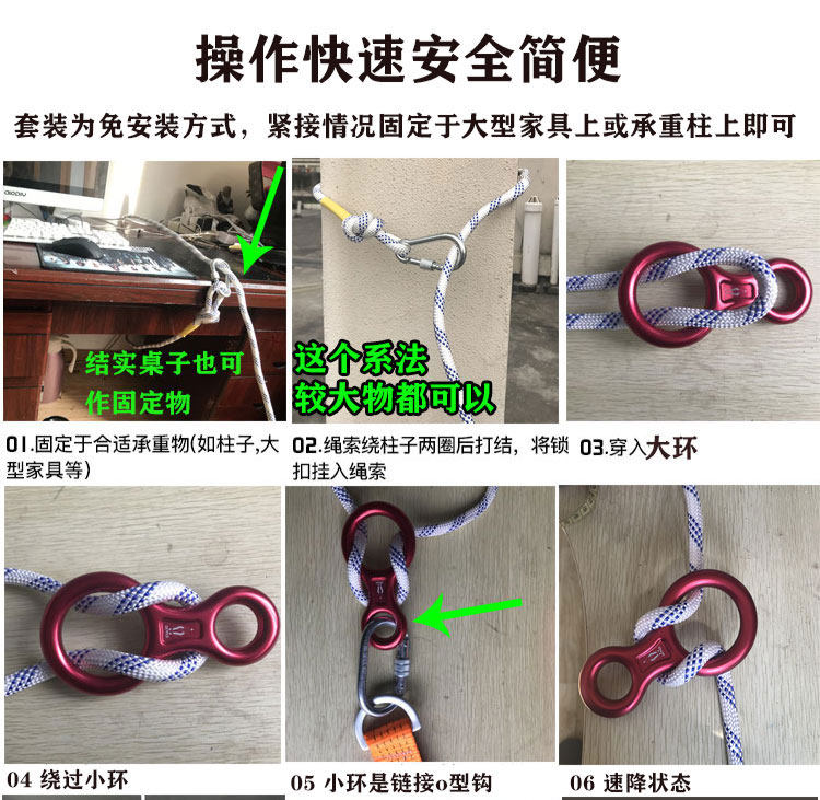 舒適褲兜式逃生安全繩8字緩降器套裝:用于救人和自救。消防員滅火救援、搶險(xiǎn)救災(zāi)或日常訓(xùn)練。結(jié)構(gòu):綱絲繩,強(qiáng)度高,延伸率小、抗沖擊性能好、耐高溫。標(biāo)準(zhǔn)承重不小于500KG 直徑8MM鋼絲2.5mm-3.2mm 防腐劑阻燃劑浸泡, 結(jié)實(shí)耐用,7天無(wú)理由退換貨(和普通鋼絲區(qū)別多了防生銹保護(hù))