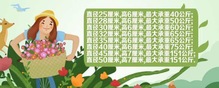 45厘米-50厘米平板螺絲款式 需要螺絲刀安裝哦,鑒于每家都有螺絲刀, 這個(gè)款式?jīng)]有配工具,謝謝!安裝時(shí),請(qǐng)安裝整板是鐵片的一面,請(qǐng)正確安裝哦,很容易的哦~小朋友都會(huì)的,謝 平板螺絲款式直徑45CM,高為6CM,非常大承重為151KG。 平板螺絲款式直徑50CM,高為6CM,非常大承重為151KG。