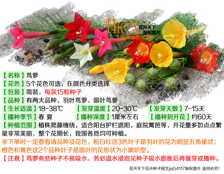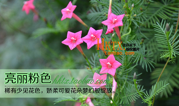 以上圖片均由店主拍攝版權(quán)歸本店!禁止商業(yè)涂改盜用! 蔦蘿可盆栽種植于陽臺護(hù)欄、或大地庭院籬笆旁等地都能很好的生長,五角星般的紅花、粉花、白花,爬藤能力強,每天有新的花朵開放,效果好看。推薦種植。 |