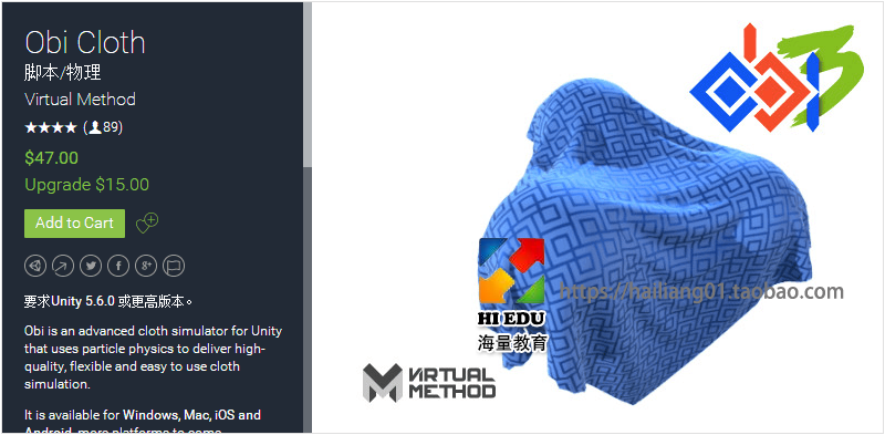 Unity3D插件 Obi Cloth 4.0.1 布料模擬器/腳本/物理/5.6版本可用價格行情