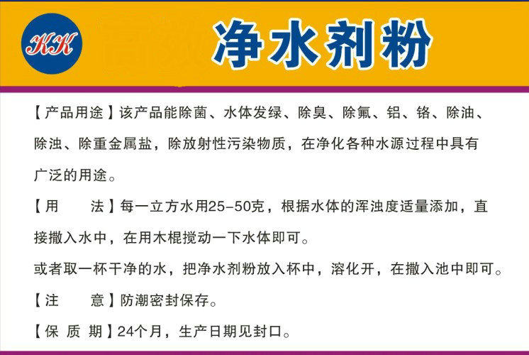 用法:每一立方水用25-50克,根據(jù)水體的渾濁度適量添加,直接撒入水中,在用木棍攪動一下水體即可 。